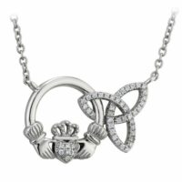 A striking necklet combining the Claddagh and the Trinity Knot and stunningly accented with clear CZs. It is amazing how nicely this necklet lays as it also comes with an adjustable chain which allows it to lay at just the right spot. Comes gift boxed.